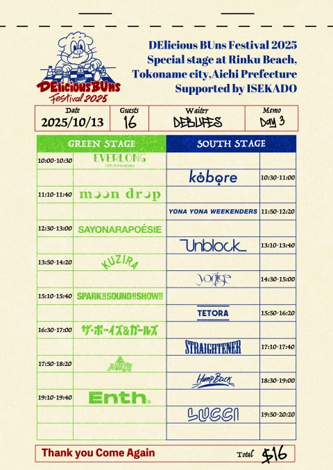 2025.10.13 EVENT 【タイムテーブル発表】DElicious BUns FESTIVAL 2025 愛知県常滑市りんくうビーチ特設ステージ 詳細はイベント公式HPにてご確認ください。 https://debufes.bunsrecords.com/