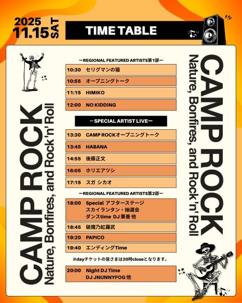 2025.11.15 EVENT 【タイムテーブル発表】【ホリエソロ】CAMP ROCK 2025 [会場] 熊本県熊本市 城南天然温泉かたるの森 キャンプエリア特設会場 [出演] スガ シカオ / 後藤正文 (ASIAN KUNG-FU GENERATION) / ホリエアツシ (ストレイテナー) / HABANA 他 MAIN MC 齊藤ふみ [お問い合わせ] info2025.camprock@dns-jp.co.jp チケット&詳細はイベント公式HPにてご確認ください。 https://camprock.jp/